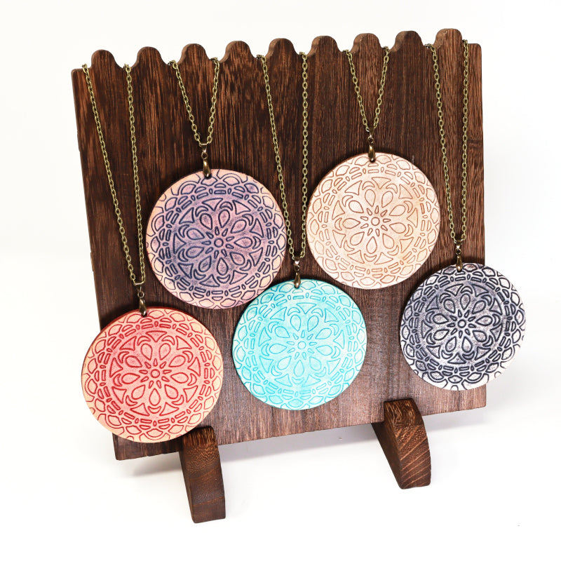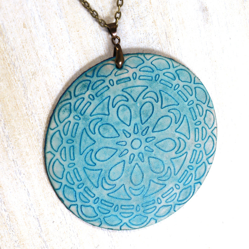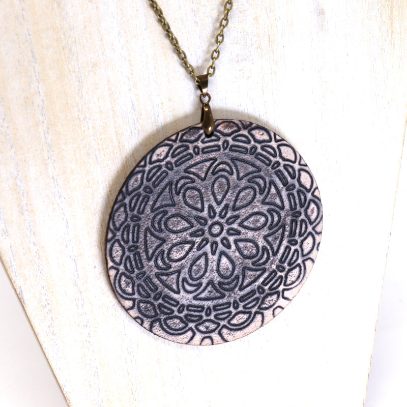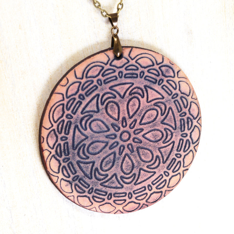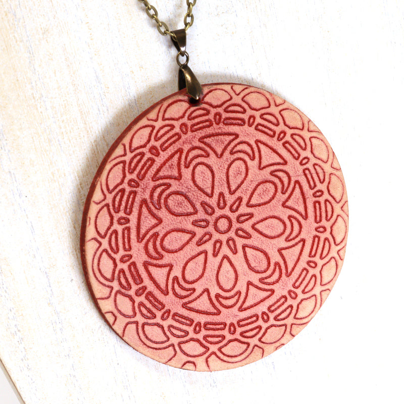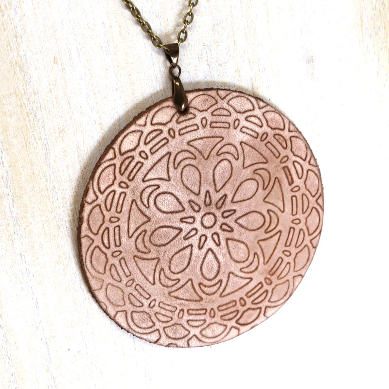A redesign of our popular Mandala Necklaces. Embossed leather mandala pendant on a 30" chain, a stunning showpiece for any occasion.