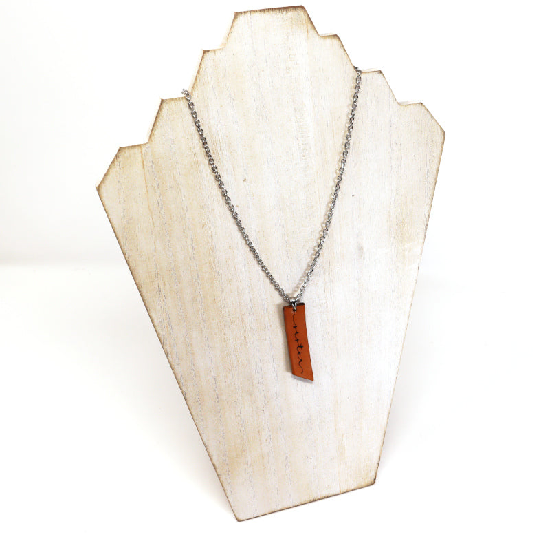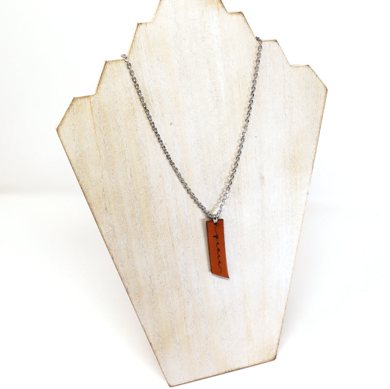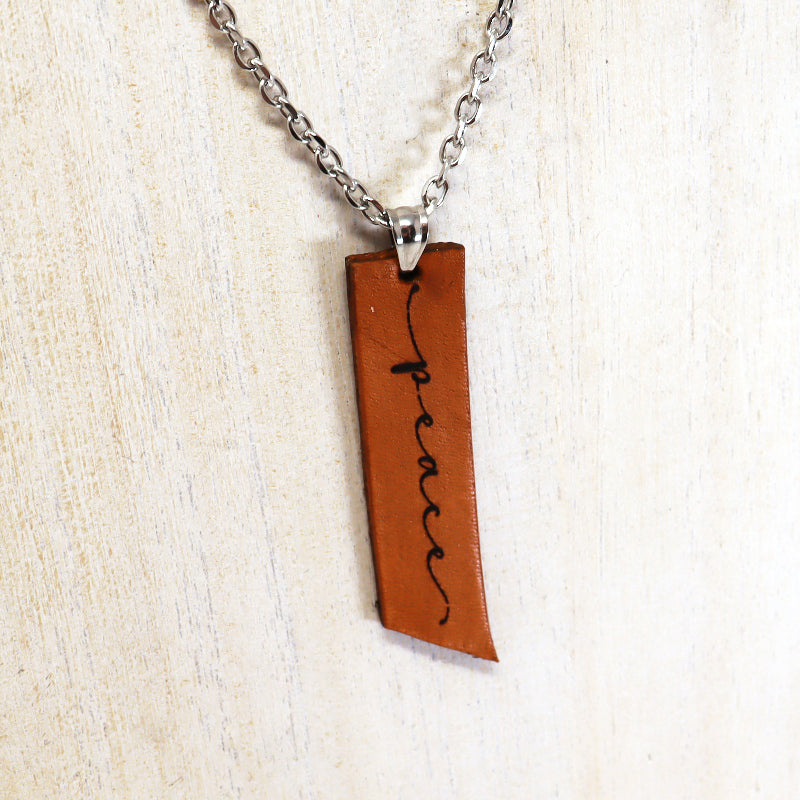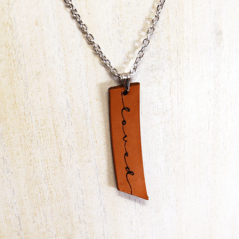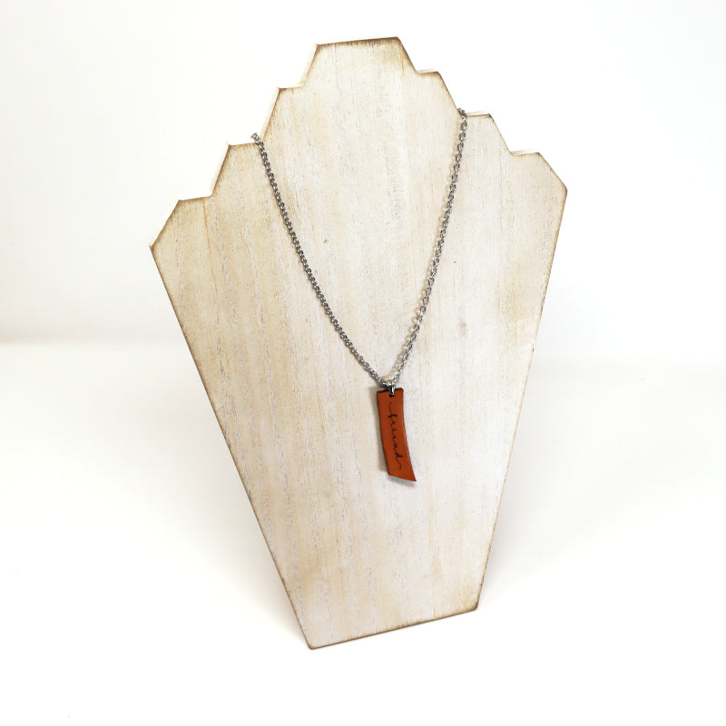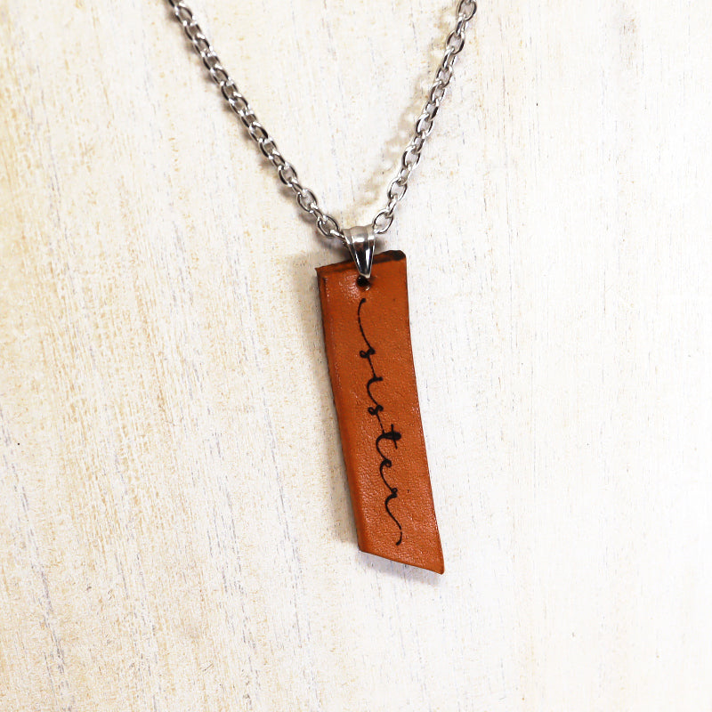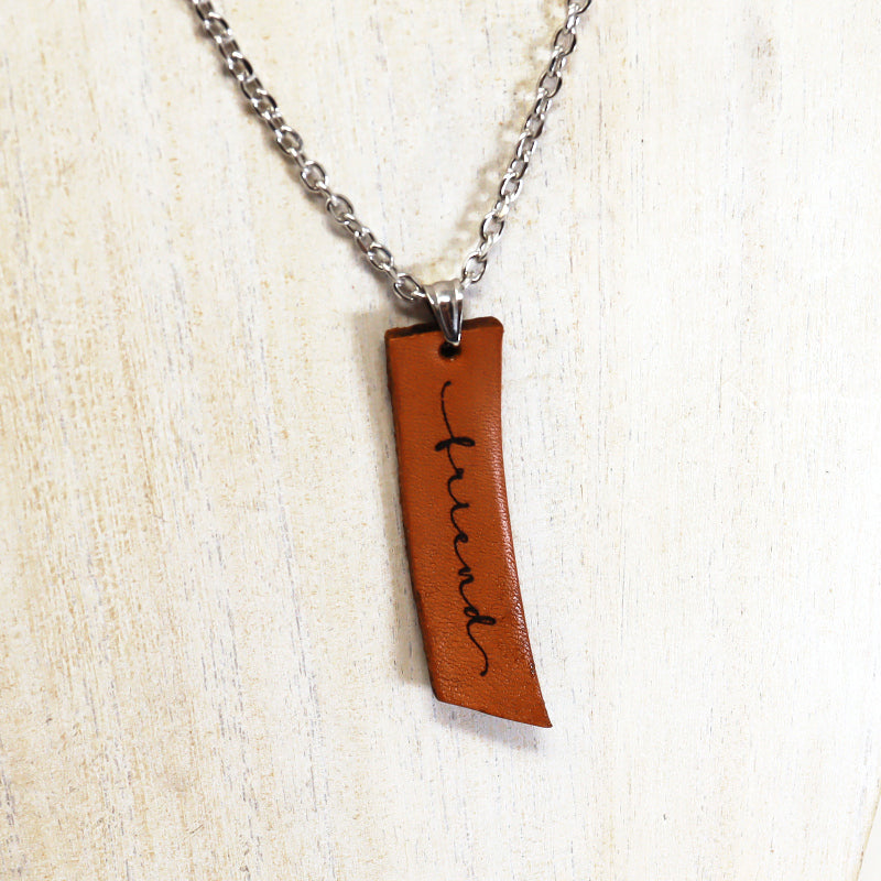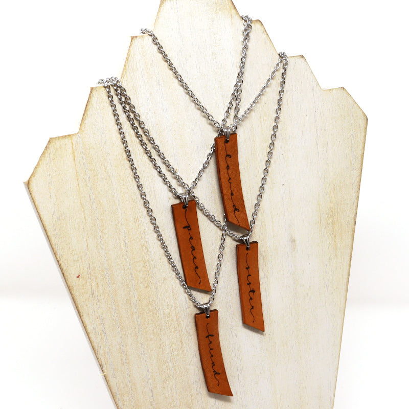 Discover the allure of our Leather Pendant Necklaces – an embodiment of elegance. Adorned with a 30" chain, each necklace boasts a meticulously engraved leather pendant, offering you the choice of subtle scripted words that resonate with you. These captivating pieces seamlessly marry delicate craftsmanship with timeless style, creating an exquisite accessory that speaks volumes.