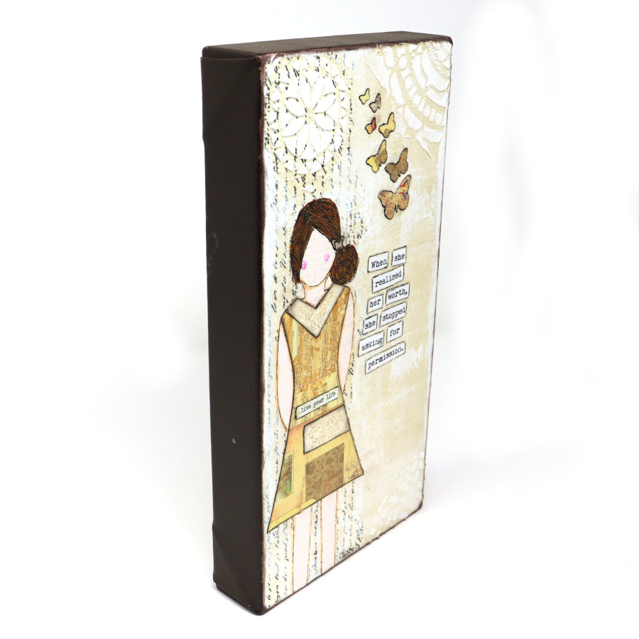 Original mixed media artwork on 12"x6" gallery thickness stretched canvas with the phrase "When she realized her worth she stopped asking for permission"
