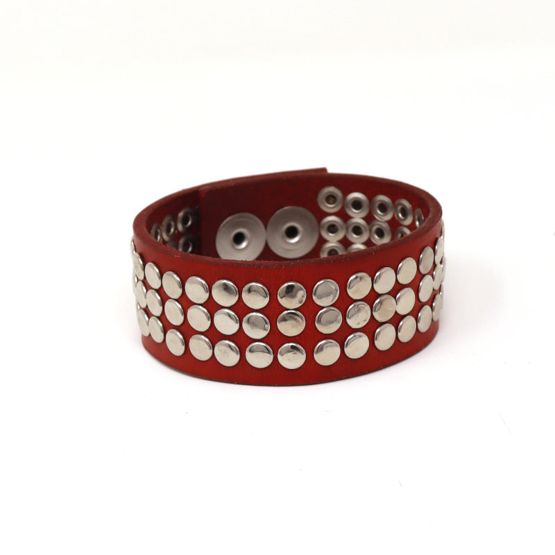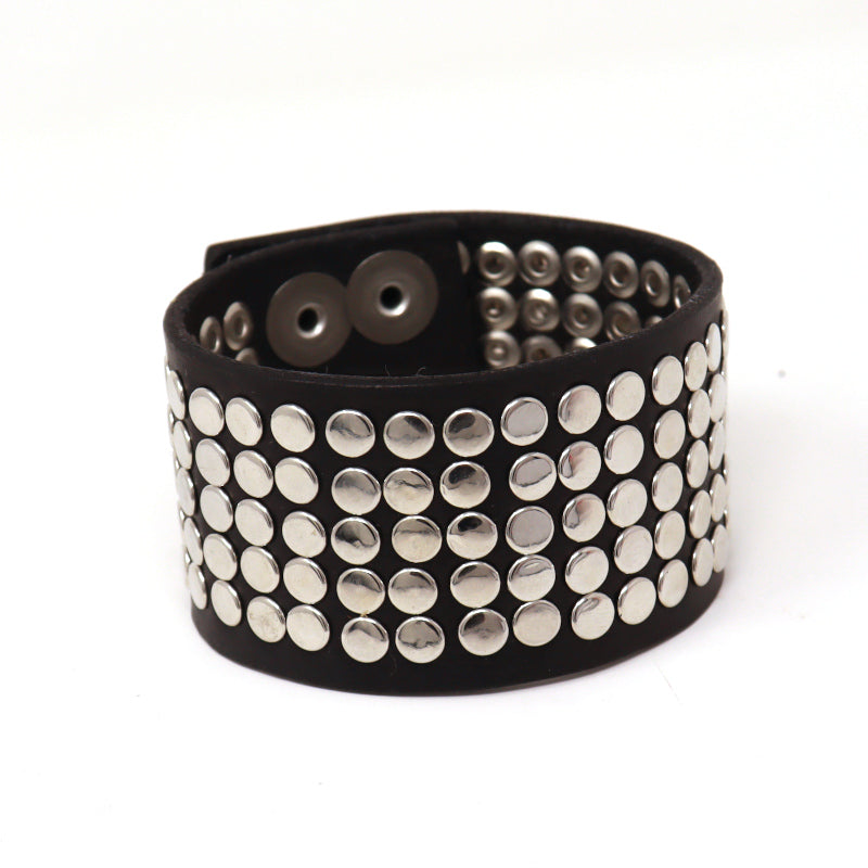 This eye catching wide leather band filled with the sparkle of carefully hand set metal rivets will not only complement any outfit, but also will also share a glimpse of your own unique badass self.